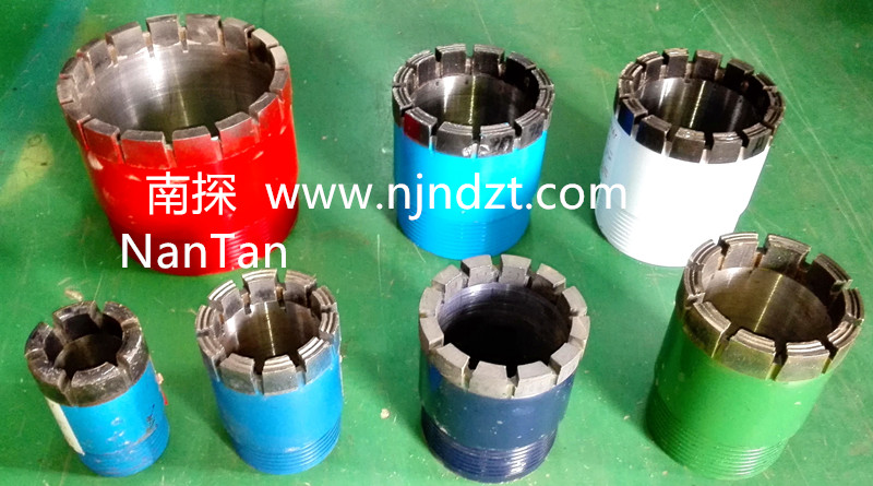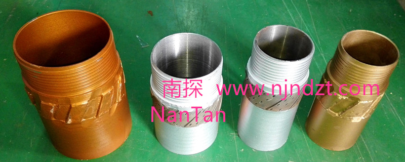 擴(kuò)孔器:連接在金剛石鉆頭與巖心管之間,起到擴(kuò)大孔徑和修整孔壁保證孔徑不縮小的一種鉆具。由于金剛石鉆頭直徑與巖心管外徑的尺寸相差很小,使孔壁與巖心管之間的間隙更加縮小,使過水受阻,并易造成卡鉆。金剛石擴(kuò)孔器是一短柱狀管體,上下鋼體部分有絲扣分別與鉆頭和巖心管相連,中間部分是覆蓋含金剛石的胎體,其外徑略大于金剛石鉆頭直徑(2毫米左右),胎體側(cè)表面上有過水水槽,使水流通過。在極堅(jiān)硬易磨性的巖層,也有使用兩個(gè)和多個(gè)擴(kuò)孔器,除一個(gè)裝在鉆頭的上部以外,其余的間隔地裝在巖心管之間。